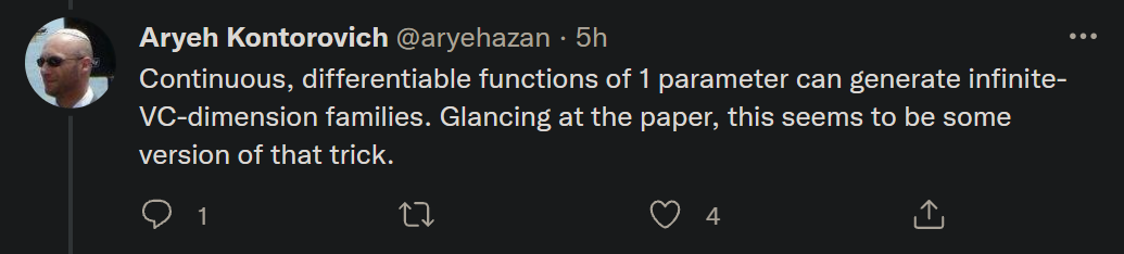 还有人表示:「1 个参数的连续可微函数可以生成无限 VC 维族。这篇论文似乎是该技巧的某个版本。」