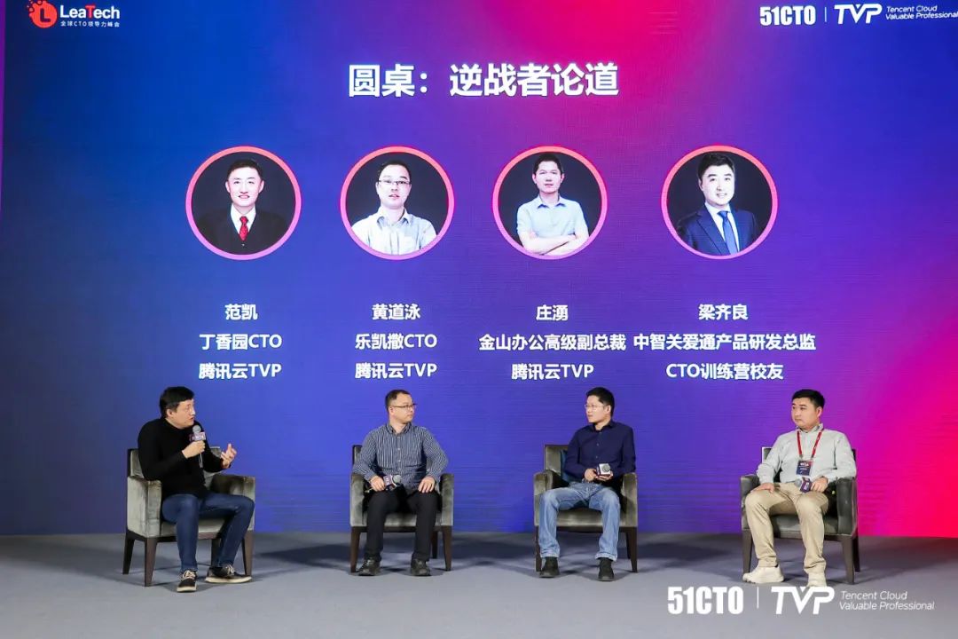 峰会末尾的圆桌论道环节,丁香园 CTO、腾讯云 TVP 范凯、乐凯撒 CTO、腾讯云 TVP 黄道泳、金山办公高级副总裁、腾讯云 TVP 庄湧以及中智关爱通产品研发总监梁齐良就企业逆势增长策略、技术价值体现、前沿技术应用与发展趋势以及各行业现状与发展前景等话题进行了深度交流,为广大参会者提供了诸多宝贵的经验与思路,也为各行业、各企业加速数字化进程描绘了前进路径。