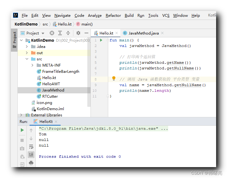 }var name = javaMethod.name 读取 私有属性 , 调用的是 JavaMethod#getName 函数 ;javaMethod.name = "Jerry" 修改 私有属性 , 调用的是 JavaMethod#setName 函数 ;fun main() {