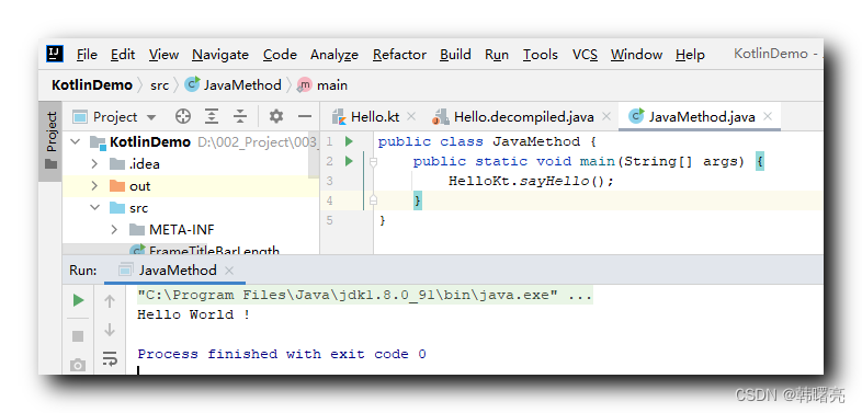 查看生成的 Java 代码 , 可以看到 最终生成的 Java 字节码中 , 类名为 Hello , 使用 @JvmName 注解 成功 修改 Java 编译类名称 ;
