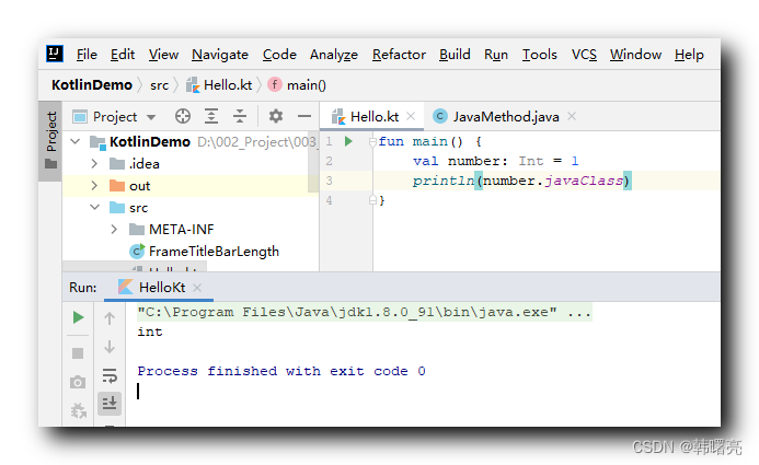 代码示例 : 在代码中 , 定义了 Kotlin 中的 Int 类型变量 , 在运行时 , 调用该变量的 .javaClass 查看其映射的 Java 类型 , 最后打印出的结果为 Java 中的 int 类型 ;