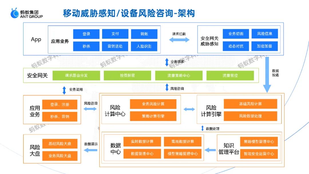 支付宝以及蚂蚁各大App都引入移动网关,移动网关是连接移动 App 客户端和服务端的桥梁,也就是说,当流量打过来会经过网关再到后端进行验签和解密,流量到后端之后会被分发到业务侧进一步处理。终端安全SDK在端上对风险提前进行感知,并把端上的各种数据特征传输到后端进行大数据计算以及机器学习,同时会有专门的安全团队对数据做进一步分析。这形成一整套的黑设备感知、终端环境安全感知的能力,而这套能力/模型可以对网关打过来的各种业务流量进行监控,对恶意流量进行阻断或者引入陷阱等方式策略管控。