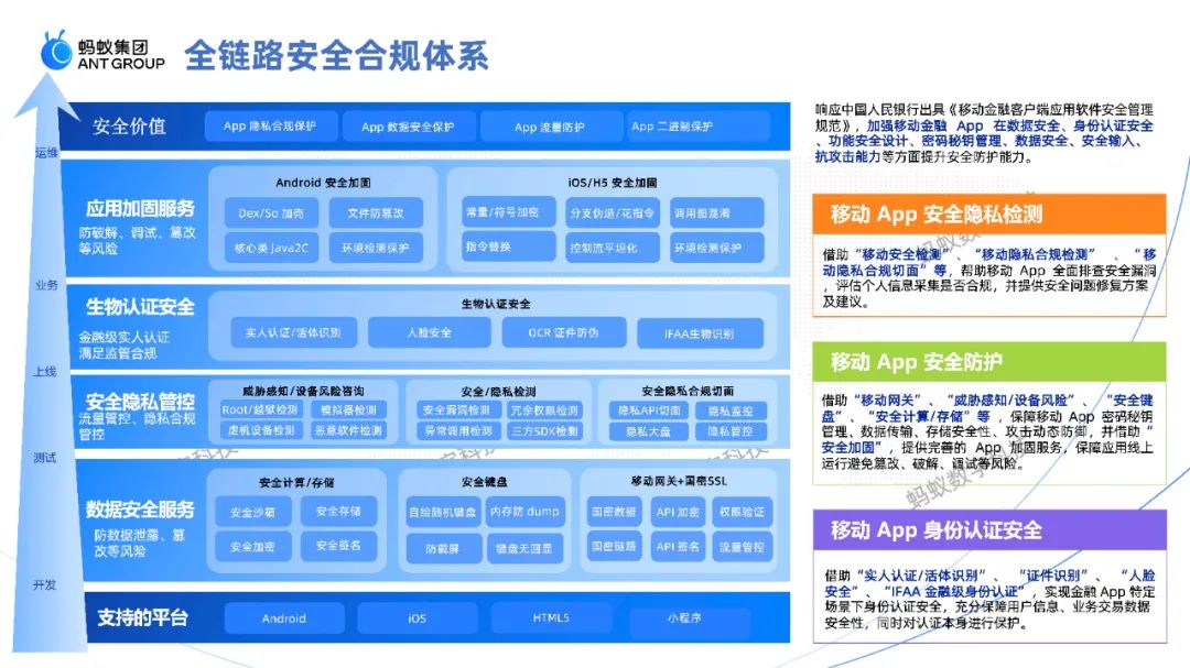 蚂蚁通过构建mPaaS全链路安全合规体系,体系覆盖安卓、iOS、H5、小程序等各个平台,也覆盖整个研发生命周期包括从开发到上线以及后期运维维护。整体体系图自下而上分为四类能力: