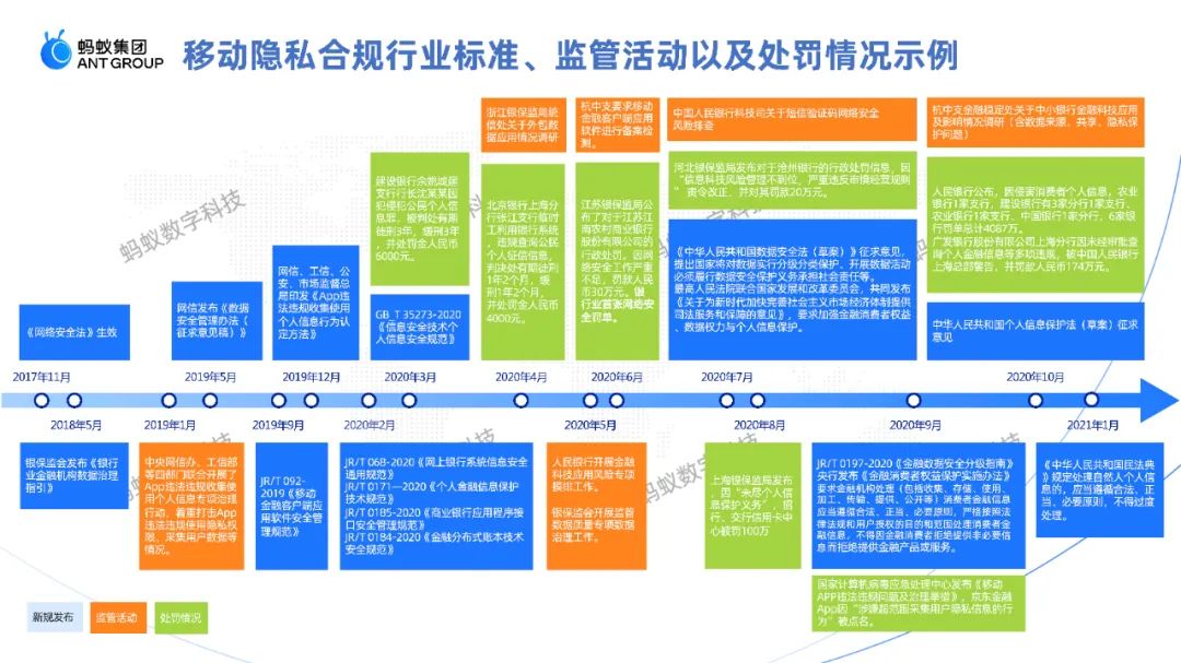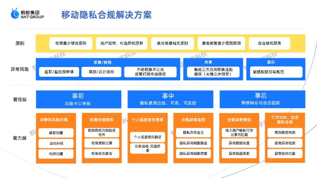 蚂蚁做了移动隐私合规管控大盘覆盖一系列的隐私异常定义信息,包括超范围申请权限、超频次、后台调用等等。当风险发生,可以根据调用链自动化生成管控下发配置进行关闭并且只定向关闭掉管控的那部分而不影响其他业务。