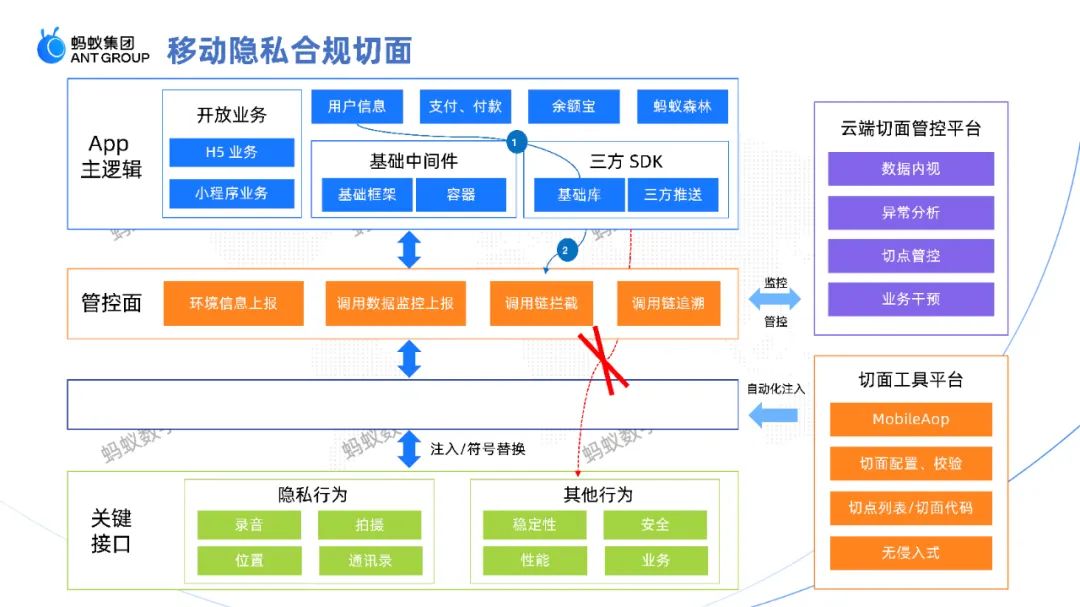 整体而言,移动隐私合规切面是核心点,一般“用户信息”是可以直接打到最下层的底层API调用的,但现在它被拦截并把所有的调用全部走到管控面,也就是从“1”到“2”的路径,通过这样的路径可以掌控线上整体情况,遇到问题时就可以进行回溯以及管控从而释放风险。