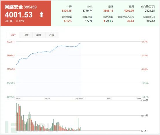 该消息发布后,网络安全板块指数涨幅超6%,全线爆发。