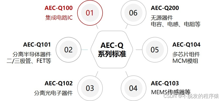 AEC-Q100适用于芯片,AEC-Q101适用于分立半导体器件,AEC-Q102适用于分立光电子器件,AEC-Q103适用于MEMS器件,AEC-Q104适用于多芯片模组,AEC-Q200适用于无源元件。