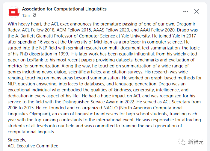 刚刚,ACL发文对其深深悼念。