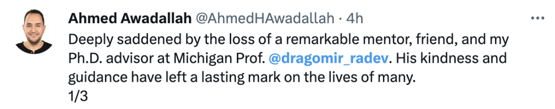 对失去一位杰出的导师、朋友和我在密歇根大学的博士生导师深感悲痛。Dragomir Radev教授的仁慈和指导在许多人的生活中留下了持久的印记。