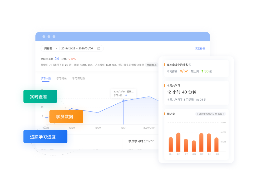 通过可视化图表对企业学员学习行为及成果进行展示,学习时长,学习频率,学习讲数一览无余。同时对比同事间学习情况和排名,激励学习共同进步。