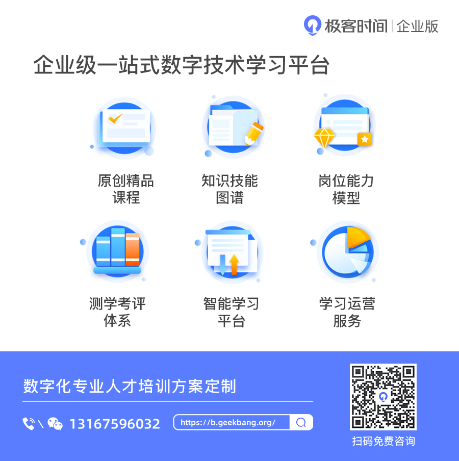 极客时间企业版是企业一站式数字技术学习平台,满足企业在快速发展过程中的数字化培训需求。