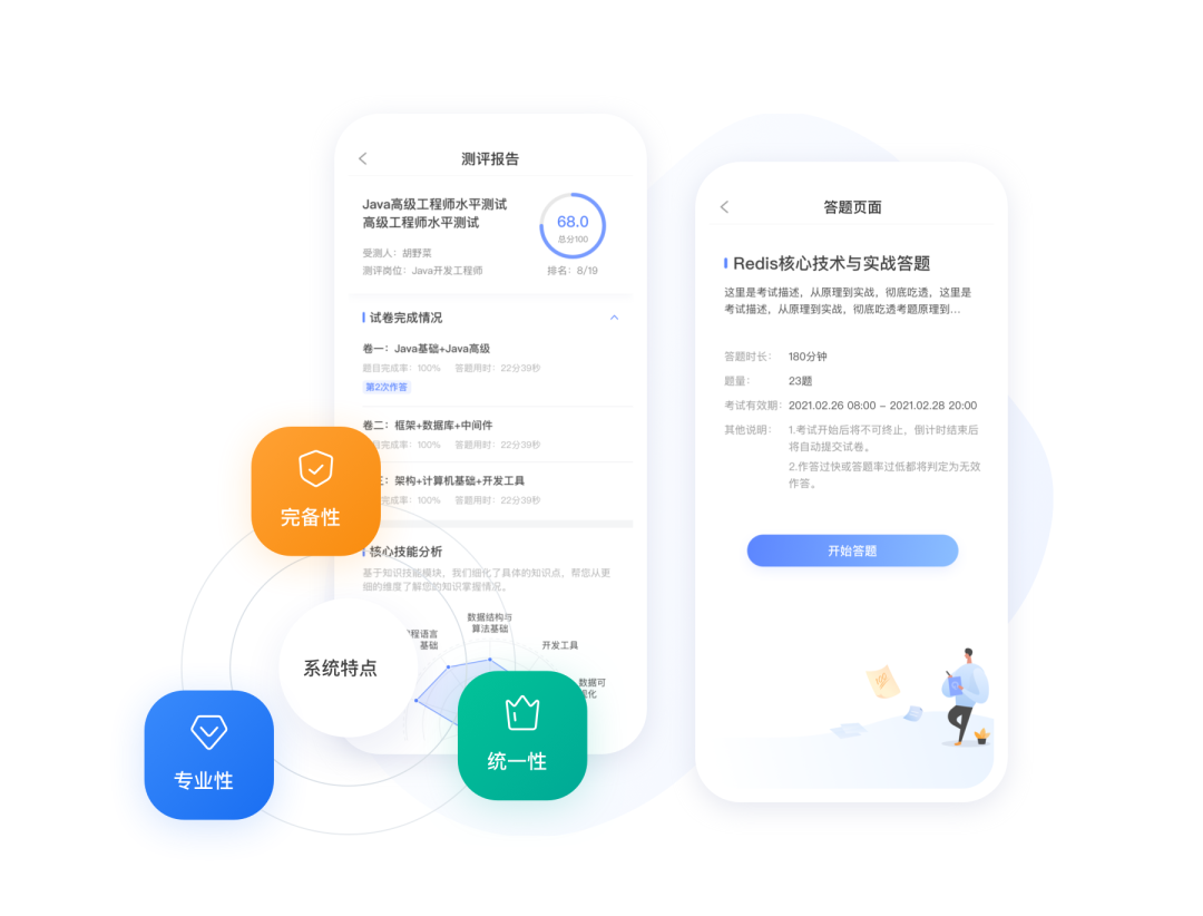 根据学员岗位,运用「JobM 团队 odel 岗位能力模型」匹配技能点,自动化分配测试内容对团队成员进行测试,产出人才岗位胜任力评估报告,根据评估报告为员工和企业推荐学习方案。