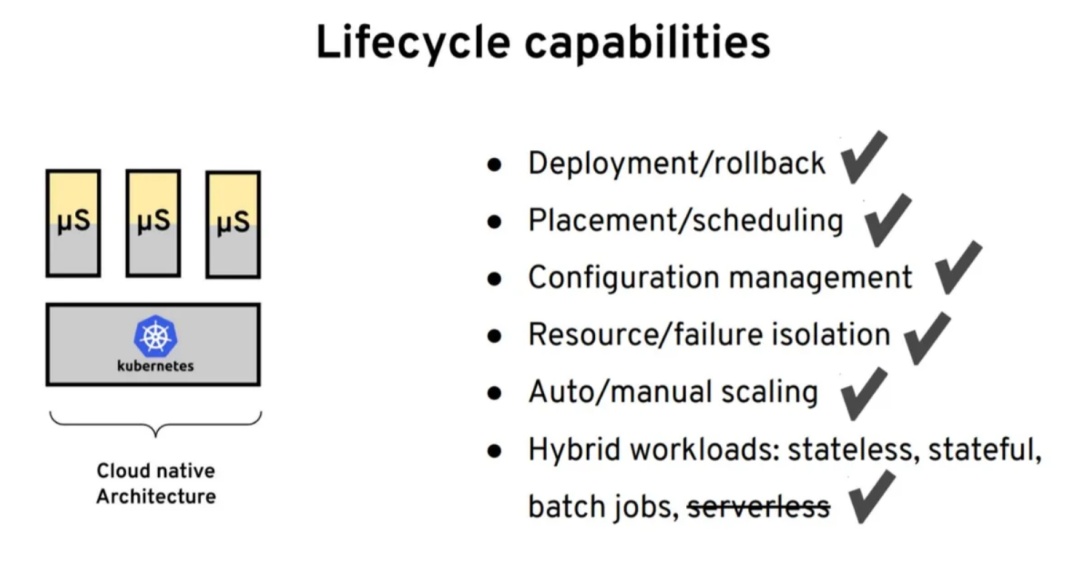 如果我们将 Kubernetes 所有的这些特性映射到我们的需求上,那么可以说 Kubernetes 满足了生命周期的要求。通常情况下,我所创建的需求列表的内容是由 Kubernetes 迄今为我们提供的功能所驱动的。这是所有平台的预期能力,Kubernetes 能够为部署所提供的特性包括配置管理、资源隔离以及故障隔离。除此之外,它还支持不同的工作负载,不过无服务器本身除外。