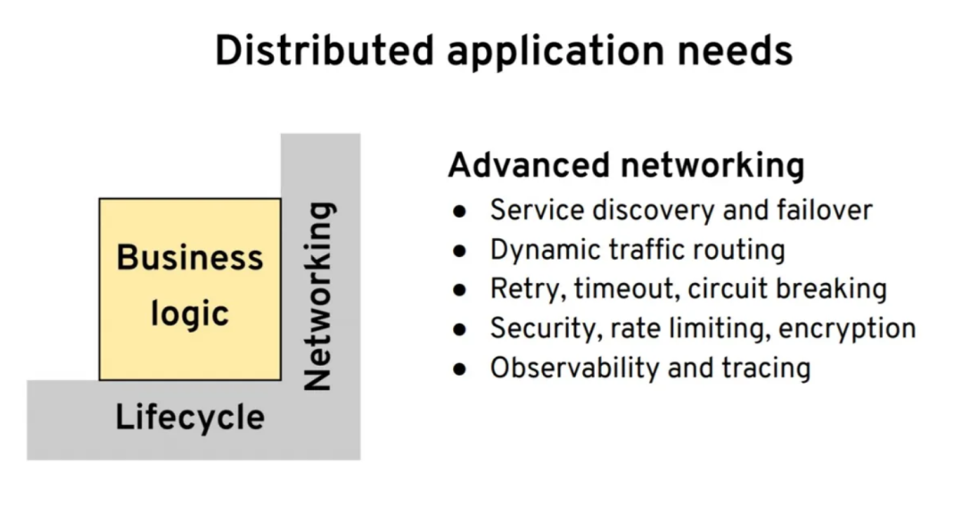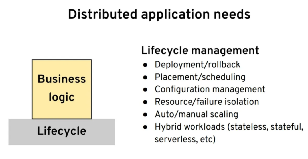 我们从分布式系统的需求开始。我所想的是我们想要创建一个应用或者服务,并编写一些业务逻辑。那么,我们需要从平台和运行时环境得到哪些支撑以构建分布式系统呢?从基础来讲,最初的需求是我们需要一些生命周期管理的能力。当我们使用任意语言编写应用的时候,我们希望能够稳定地打包和部署应用,进行回滚和健康检查。并且能够将应用放到不同的节点上,进行资源隔离、扩展、配置管理,以及所有类似这样的事情。这些都是我们创建分布式应用所需要的最基本的东西。