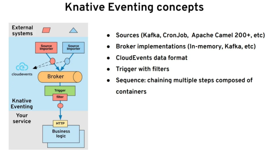 Knative Eventing 为我们提供了一个完全声明式的事件管理系统。假设我们有一些想要集成的外部系统和一些外部的事件生产者,在底层,我们让自己的应用运行在一个容器中,它具有一个 HTTP 端点。借助 Knative Eventing,我们可以启动一个 broker,它可以触发一个映射到 Kafk 的 broker,也可以触发内存或云服务。除此之外,我们还可以启动一个导入器(importer),将其连接到外部系统上并将事件导入到我们的 broker 中。比如,这些导入器可以基于 Apache Camel,它有数百个连接器。