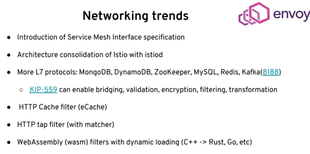 我选择的另外一个项目是 Envoy。服务网格接口的引入能够让我们更容易地切换不同的服务网格实现。在部署方面,对 Istio 有了一些整合。现在,你不需要部署七个 pod 了,而只需要部署一次。更有意思的是 Envoy 项目在数据平面上所发生的变化。我们看到越来越多的第七层协议添加到了 Envoy 中。