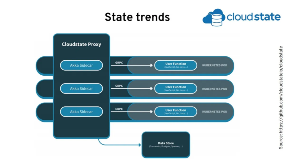 我想要讨论的另一个项目是 Cloudstate 以及状态相关的新趋势。Cloudstate 是 Lightbend 的一个项目,主要专注于无服务器和函数驱动的开发。在最新版本中,他们正在使用 sidecar 和 operator 与 Kubernetes 进行深度集成。