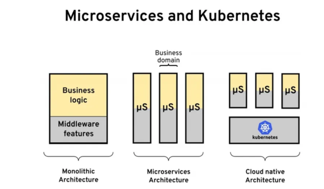 接下来,我建议我们看一下云原生架构以及这些需求是如何变化的。如果我们从一个比较高的层面来看这些架构的变化的话,就会发现云原生可能是从微服务运动开始的。微服务允许我们将一个单体应用按照业务域进行拆分。实践证明,容器和 Kubernetes 实际上是管理这些微服务的绝佳平台。接下来,我们看一下 Kubernetes 有哪些具体的特性和能力,使其成为微服务领域特别有吸引力的方案。