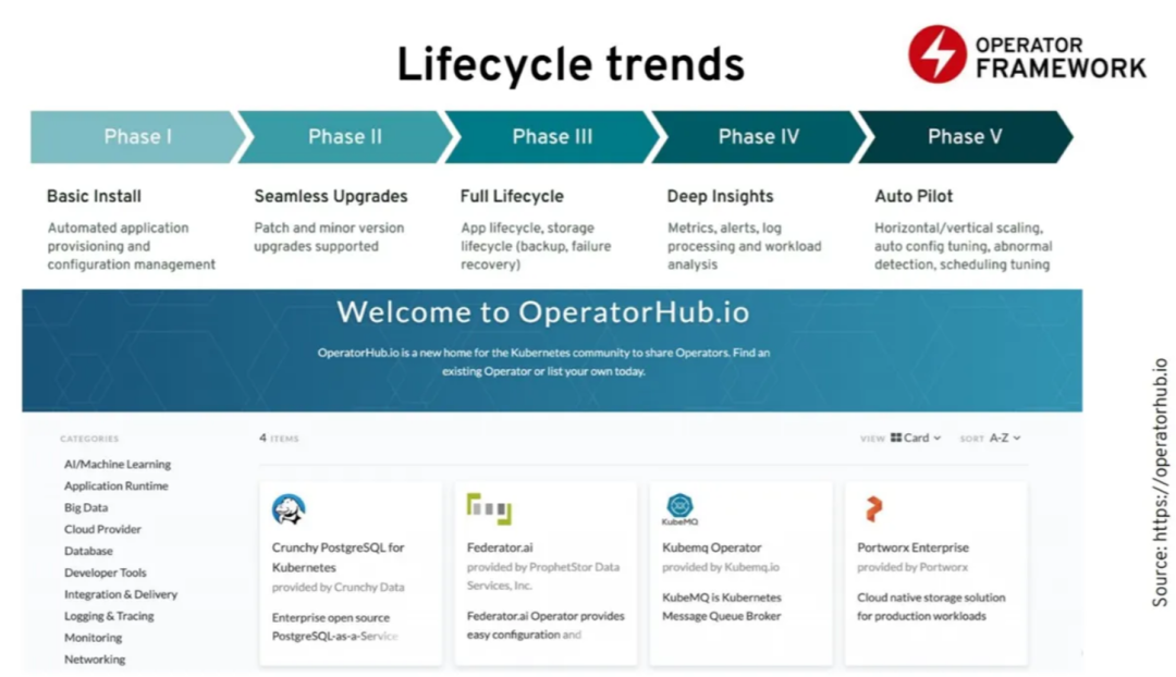 Operator SDK 允许我们编写 operator,Operator Lifecycle Manager 能够管理 operator 的生命周期,而 OperatorHub 则可以发布 operator。如果感兴趣的话,我们可以看到上百个管理数据库、消息队列和监控工具的 operator。从生命周期角度来看,operator 可能是在 Kubernetes 生态系统中最活跃的开发领域。