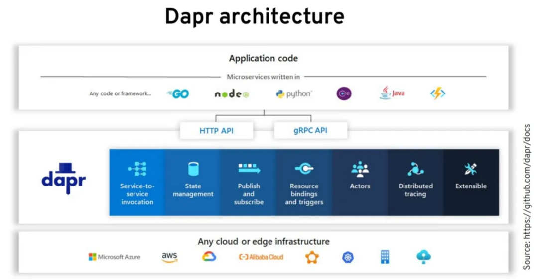 从较高的层级来看,这种架构是将我们的应用放在最顶层,而应用可以采用任意的语言。我们可以使用 Dapr 提供的客户端库,但并不强制要求这样做。我们可以使用语言本身的特性来发起 HTTP 和 gRPC 调用 sidecar。它与服务网格差异在于 Dapr sidecar 并不是一个透明的代理。它是一个显式的代理,我们必须要在应用中调用它,并通过 HTTP 或 gRPC 进行交互。根据我们所需要的能力,Dapr 可以与其他的系统进行交互,比如云服务。