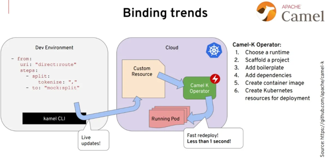 我们可以在 Camel 中使用 Java、JavaScript 或 YAML 等语言编写集成逻辑。最新版本引入了一个在 Kubernetes 中运行并能理解我们的集成需求的 Camel operator。当我们在编写 Camel 应用程序时,会将其部署到一个自定义的资源中,然后 operator 就能知道如何构建容器或找到依赖。根据平台的能力,无论是单纯的 Kubernetes,还是与 Knative 结合的 Kubernetes,它都能决定使用什么服务以及如何实现我们的集成需求。在我们的运行时之外,会有相当多的智能处理,但是它们都在 operator 中,所有的这一切运行都非常快。为什么我将其称之为一个绑定方面的新趋势呢?主要是因为 Apache Camel 的能力都是由它提供的连接器实现的。这里有趣的一点是它如何与 Kubernetes 深度整合。