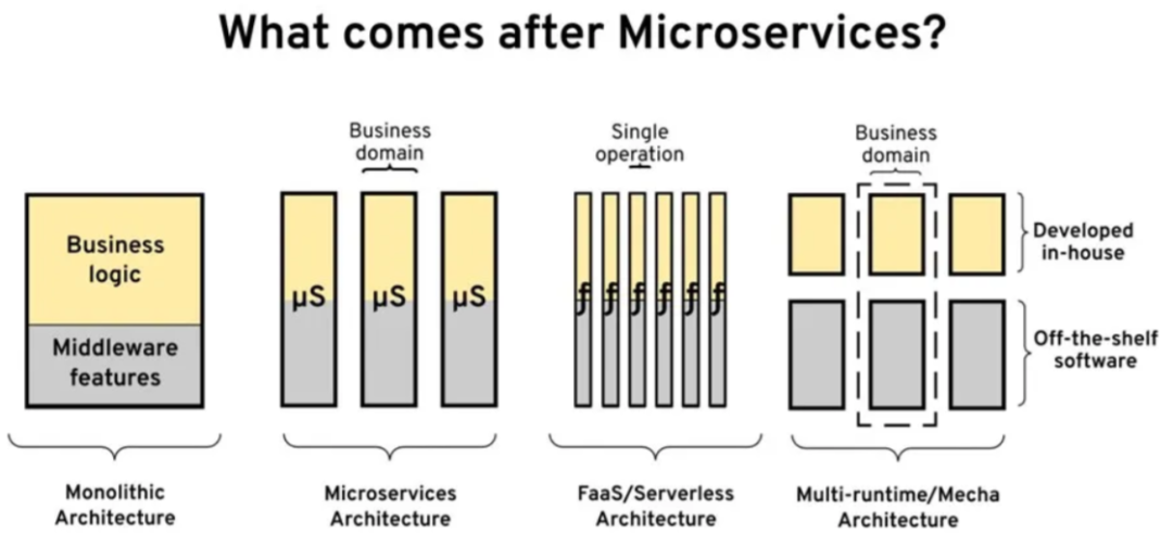 如果我们看一下架构是如何发展的,会发现从较高的层次来看,应用架构是从单体应用开始的。然而,微服务为我们提供了如何将单体应用拆分成独立的业务域的指导原则。从此之后,出现了无服务器和函数即服务(FaaS),我们可以进一步将系统拆分为操作(operation),这带来了极强的扩展性,因为我们可以独立扩展每个操作了。