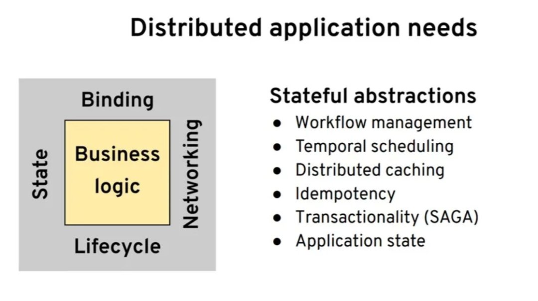 你认为最后一类会是什么呢?它就是状态。当我提到状态和状态化抽象的时候,我讨论的不是实际的状态管理,比如数据库或文件系统所做的事情。我更多的是讨论开发人员对那些幕后依赖状态的功能的抽象。也许,你需要进行工作流管理。可能你想要管理长时间运行的进程,或者要进行时间调度,或者要实现一些 cron job 来定期运行服务。也许,你想要实现分布式缓存、保证幂等性或者能够回滚。所有的这些都是开发人员层面的原语(primitive),但是在幕后,它们依赖于一些状态。我们希望能拥有这些抽象来创建健壮的分布式系统。