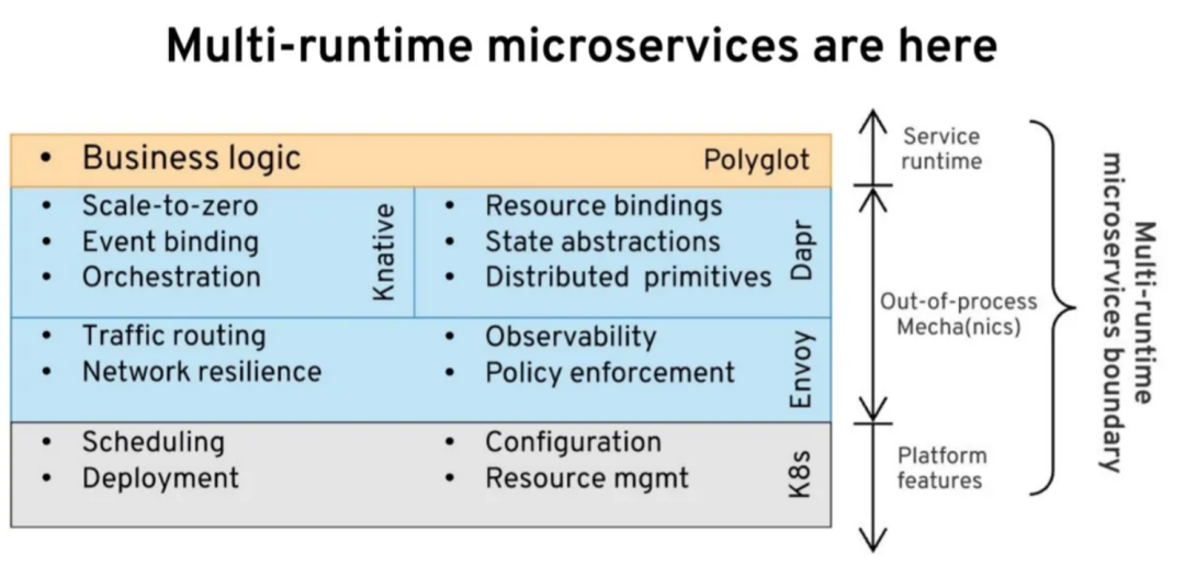 如果我们看一下微服务在 Kubernetes 上的样子,就会发现我们需要一些平台性的功能。此外,我们还需要使用 Kubernetes 的功能,主要用于生命周期管理。然后,我们很可能会透明地使用一些服务网格,比如 Envoy,以得到增强的网络能力,不管是流量路由、弹性、增强的安全性,还是为了监控的目的。除此之外,根据我们的使用场景,可能还需要 Dapr 或 Knative,这取决于工作负载。所有的这些都是进程外的附加能力。我们剩下的就是编写业务逻辑了,不过这不是在这些基础设施之上,而是在另外一个单独的运行时中。最有可能出现的是,未来的微服务将是多个容器组成的多运行时,其中有些是透明的,有些是显式使用的。