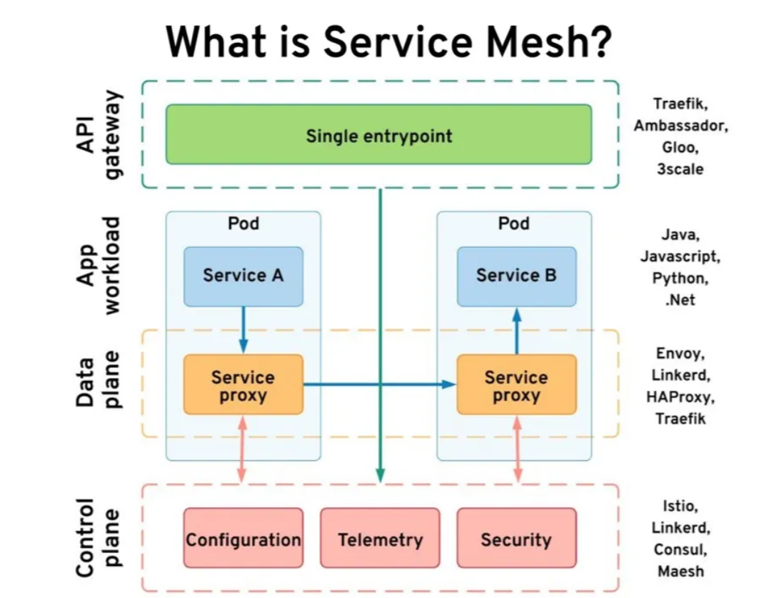 这些服务代理的集合代表了数据平面,它们通常是非常小且无状态的。为了获取所有的状态和配置,它们会依赖于控制平面。控制平面是有状态的部分,它会保持所有的配置,收集指标,做出决策并与数据平面进行交互。实际上,我们还需要另外一个组件,也就是将数据输入到集群的 API 网关。有些服务网格有自己的 API 网关,有些则会使用第三方的网关。但是,如果你查看一下所有的这些组件的话,会发现它们都提供了我们想要的能力。