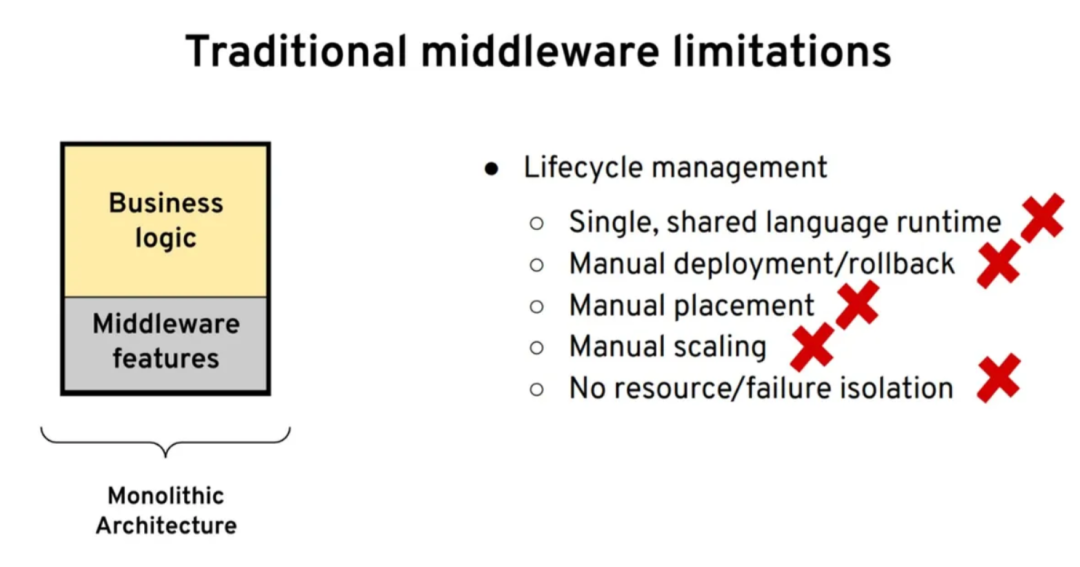 它具备网络连接可靠性方面所有的功能,所以它能够实现重试。可能从本质来讲,ESB 并不是分布式的,所以它不需要非常高级的网络和发布功能。ESB 缺乏的主要是生命周期管理。因为它是一个单运行时,第一个问题就是你会被限制使用单一的语言。这通常对应真正的运行时在构建中所使用的语言,比如 Java 或.NET 等。然后,因为它是一个单运行时,我们无法很容易地进行声明式部署或自动放置(automatic placement)。部署是非常庞大和重量级的,所以通常会涉及到人工的交互。而这样一个单体架构所带来的另外一个困难就是扩展性。“我们无法扩展单个组件。”