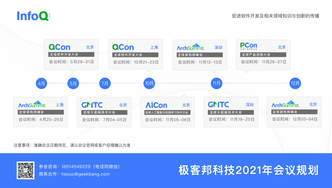 另外除 QCon 上海,今年我们还将在深圳、北京等地举办 5 场技术大会,方向覆盖前端、AI、产品等,多场大会仍处优惠期,购票及咨询请联系票务小姐姐:13269078023(微信同电话)。