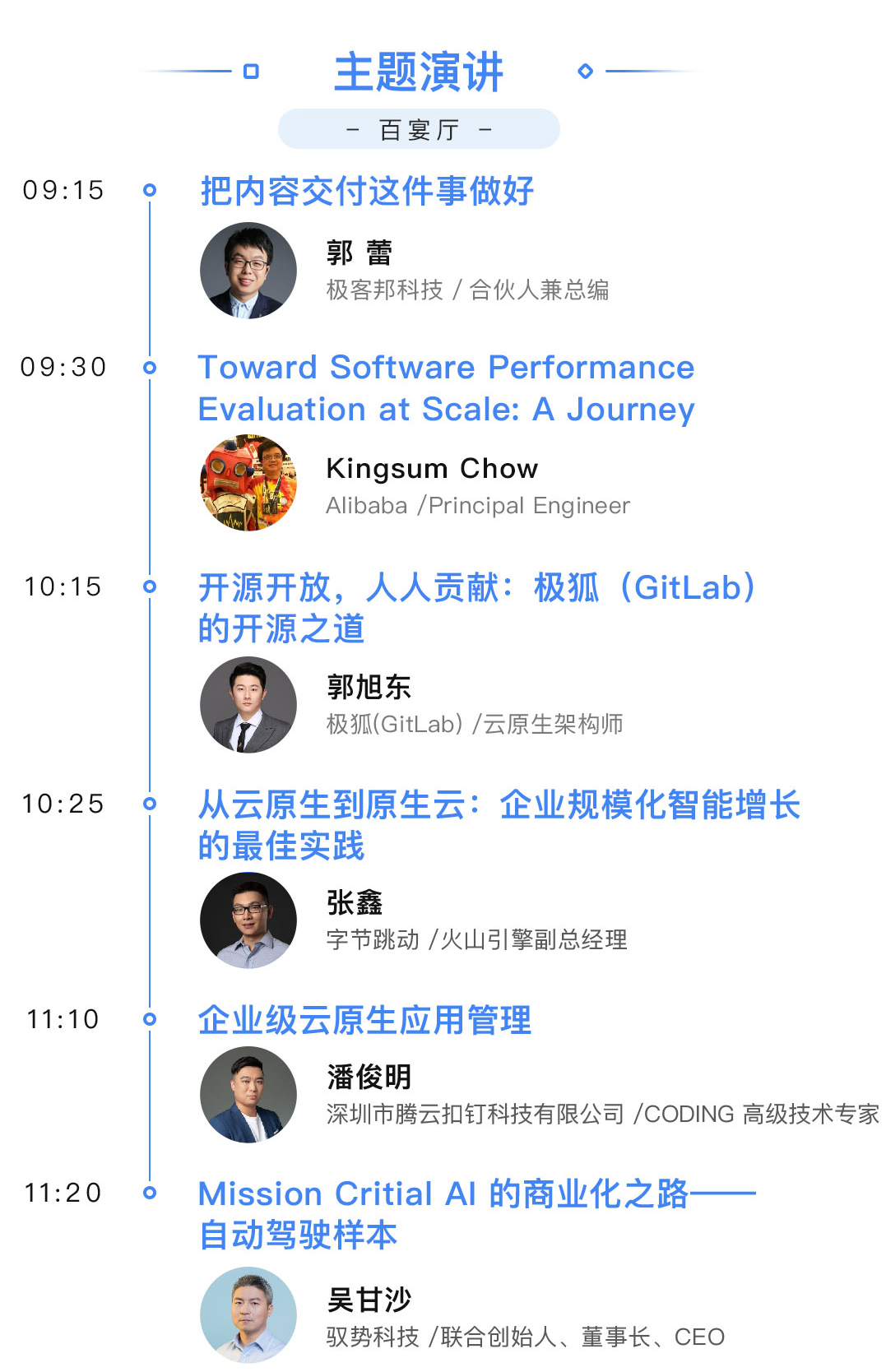 大会第一天上午邀请到 Alibaba Principal Engineer Kingsum Chow、字节跳动火山引擎副总经理张鑫、驭势科技联合创始人 / 董事长 /CEO 吴甘沙等 6 位嘉宾带来主题演讲。