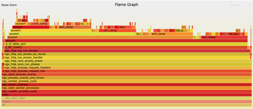 在 CPU 升高现象上,通过火焰图可以明显看到大部分 CPU 的时间都是划在 auxsort上,它是由 FUNCC 触发。而 FUNCC 的触发也指明了一个问题,就是证明相关数据没有经过 LuaJIT,只有图中最右侧的一小部分处理了正常请求。