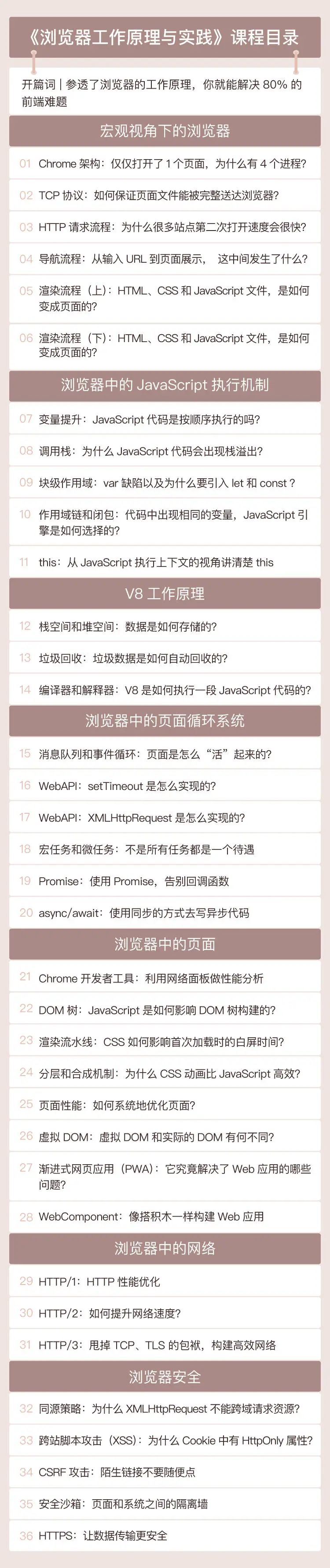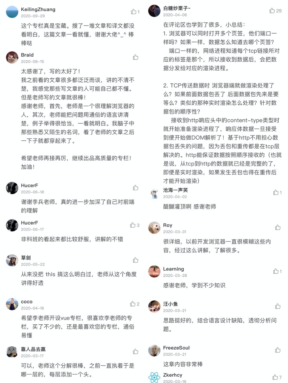 他的经历也非常传奇(下面详细说),自然写的专栏也是与众不同,更具实操性。身边的技术小哥有很多也经常拿出来 2 刷,还专门采访了几位。普遍说整体读起来的感觉,就是通俗易懂,深入浅出,让我把浏览器,把网络、页面渲染、JavaScript、浏览器安全、V8 原理等知识都串联起来,对整个前端体系有了全新的认识。