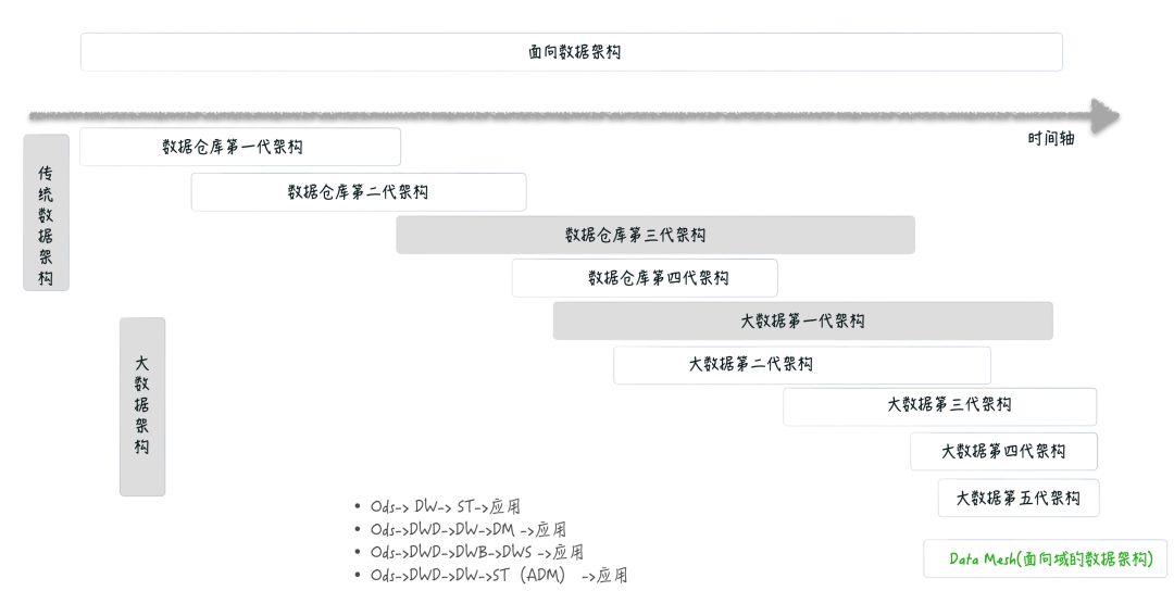 数据仓库在国外发展多年,于大约在 1998-1999 年传入中国。进入中国以后,发展出了很多专有名词,比如数据仓库、数据中心、数据平台、数据中台、数据湖等,从大数据架构角度来看可用三个时代九种架构来做总结,其中前四代是传统数据仓库时代的架构,后面五代是大数据架构模式。其中有两个承前启后的地方:
