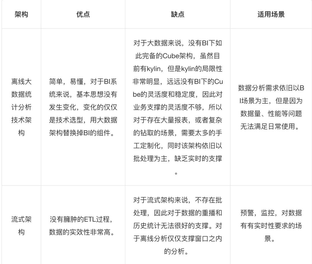 这代架构定位是为了解决传统 BI 的问题,简单来说,数据分析的业务没有发生任何变化,但是因为数据量、性能等问题导致系统无法正常使用,需要进行升级改造,此类架构便是为了解决这个问题。
