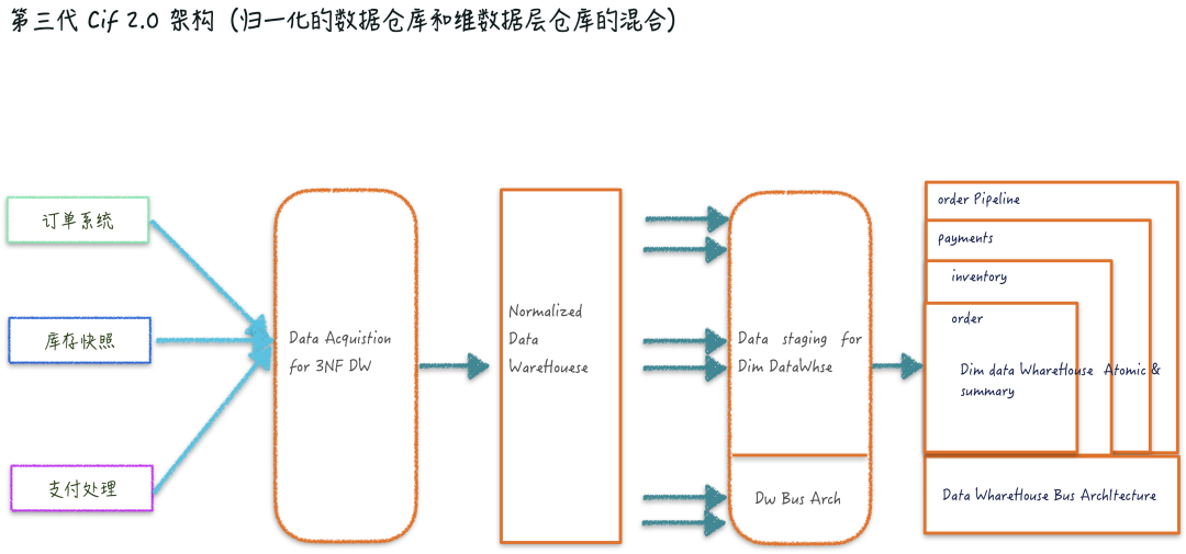 刚好 CIF 架构模式也逐步的变成了数据仓库第三代架构。为什么把这个 CIF 架构定义成一个经典架构呢,因为 CIF 的这种架构总结了前面提到的两种架构的同时,又把架构的不同层次定义得非常明确。