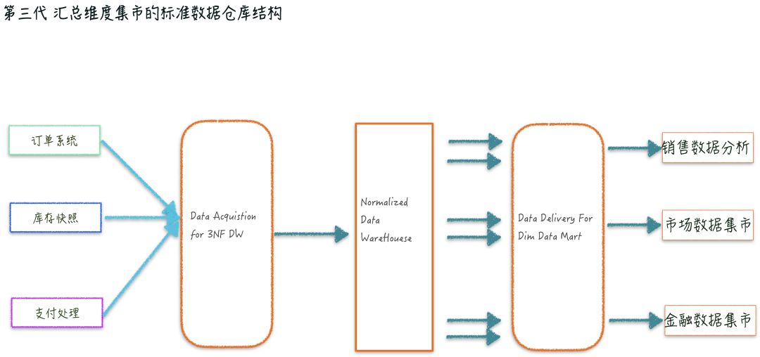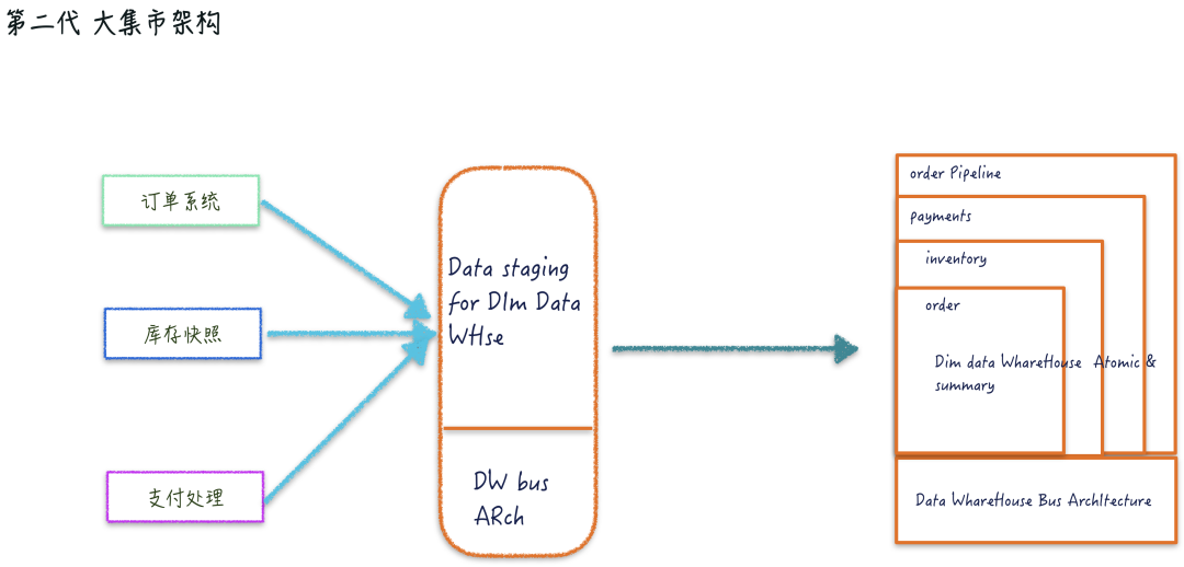 第二代就是 Ralph kilmball 的大集市的架构。第二代架构基本可以成为总线型架构,从业务或部门入手,设计面向业务或部门主题数据集市。Kilmball 的这种构建方式可以不用考虑其它正在进行的数据类项目实施,只要快速满足当前部门的需求即可,这种实施的好处是阻力较小且路径很短。