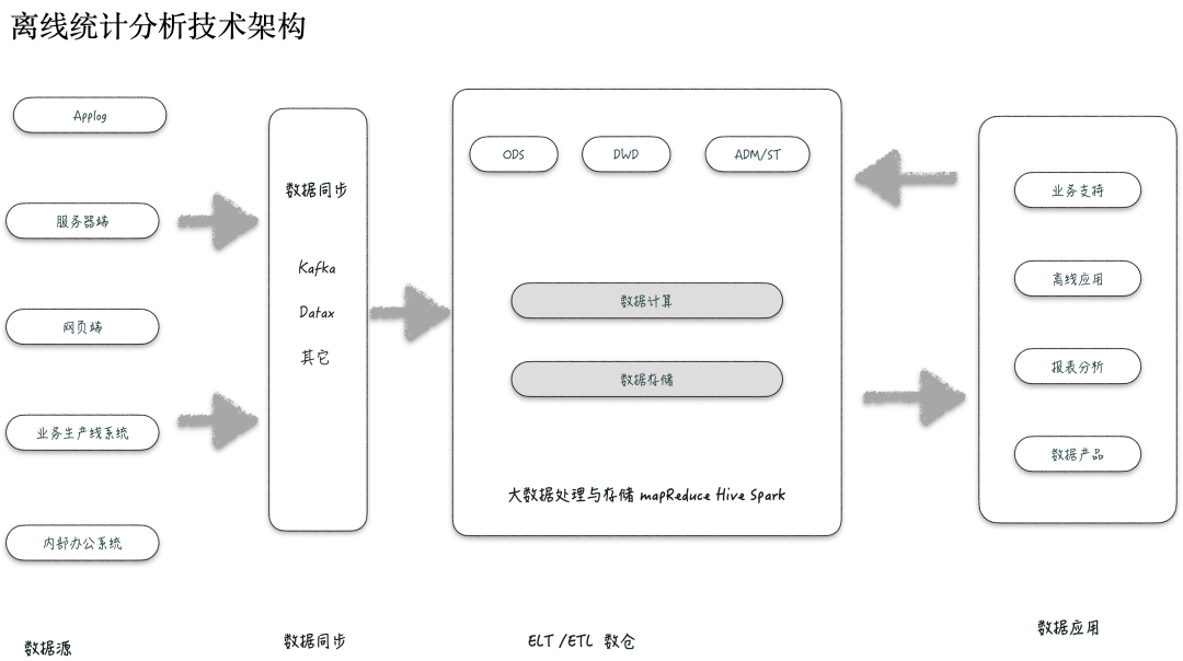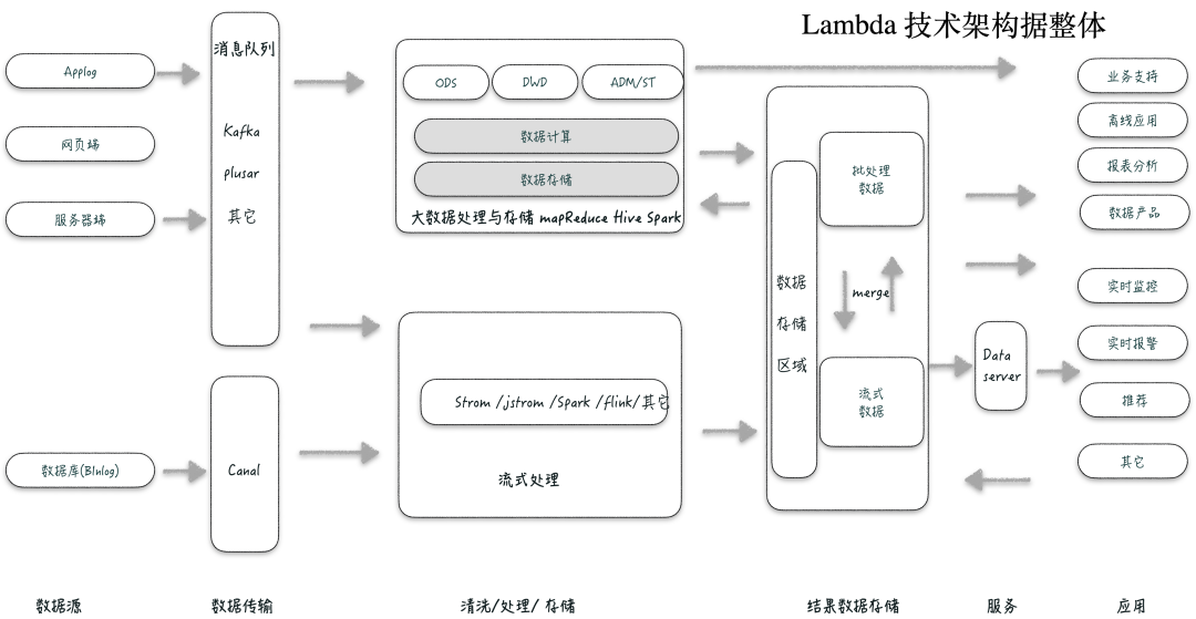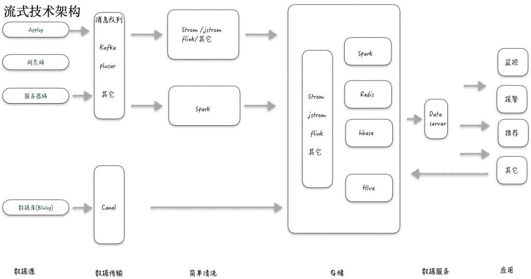 比如说在 Hadoop&Hive 刚兴起的阶段,有用 SyaseIQ、Greenplum 等技术来作为大数据处理技术,后来 Hadoop&hive 以及 Facebook Scribe、Linkedin kafka 等逐步开源后又产生了新的适应互联网大数据的架构模式。