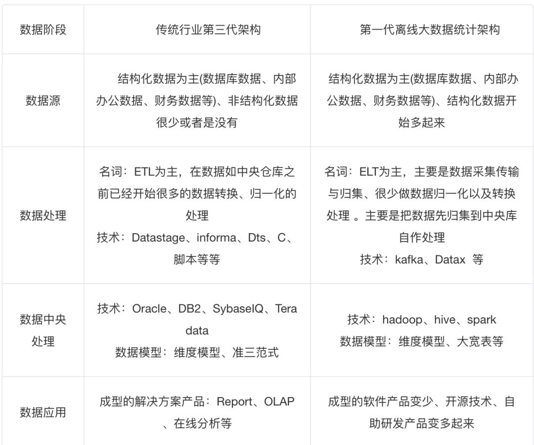 在文章的开头有提过,传统行业第三代架构与大数据第一代架构在架构形式上基本相似,只不过是通过大数据的处理技术尝试对传统第三架构进行落地的。