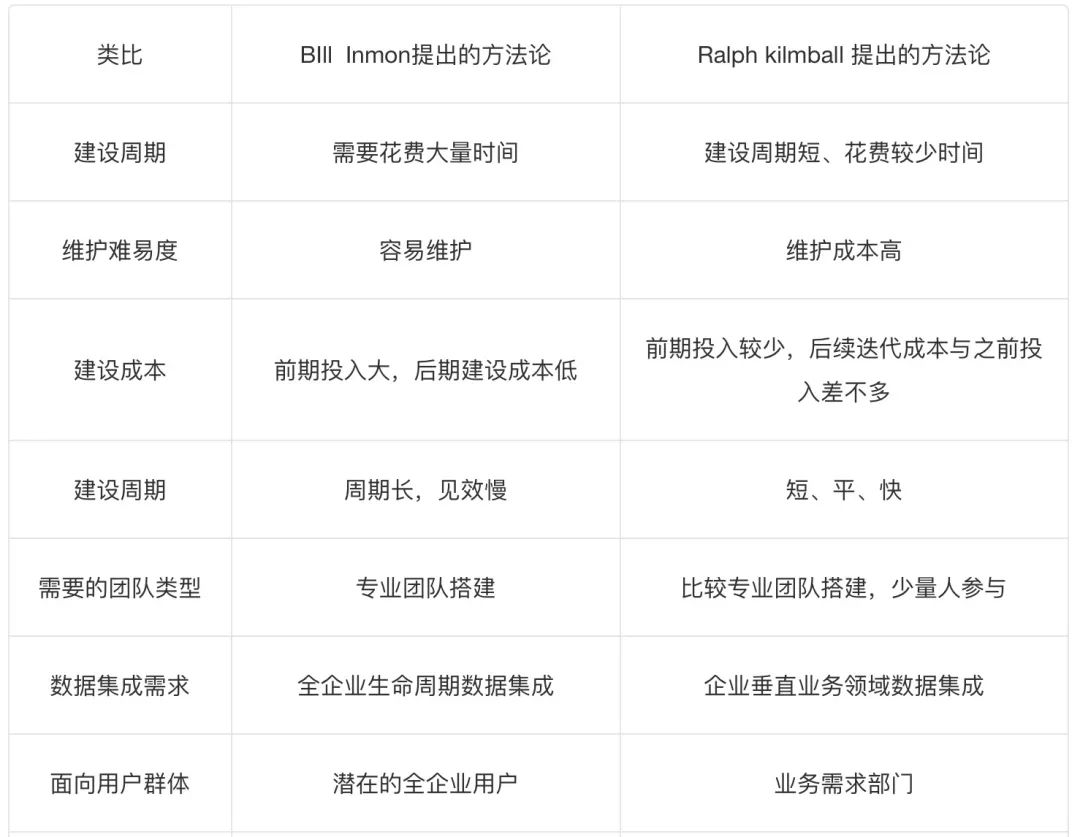 Bill Inmon 提出的遵循的是自上而下的建设原则,Ralph kilmball 提出自下而上的建设原则,两种方法拥护者会在不同场合争论哪一种方法论更有优势。