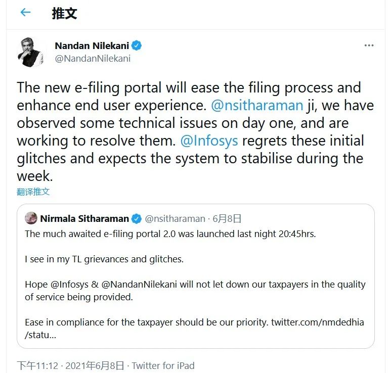 上面推文用中文表达是,“新的电子报税门户将简化申请流程并增强最终用户体验。@nsitharaman,我们已第一时间观察到技术问题,而且正努力着手解决。@Infosys 对发生的小问题感到非常遗憾,并希望能让系统在本周内恢复稳定运行。”