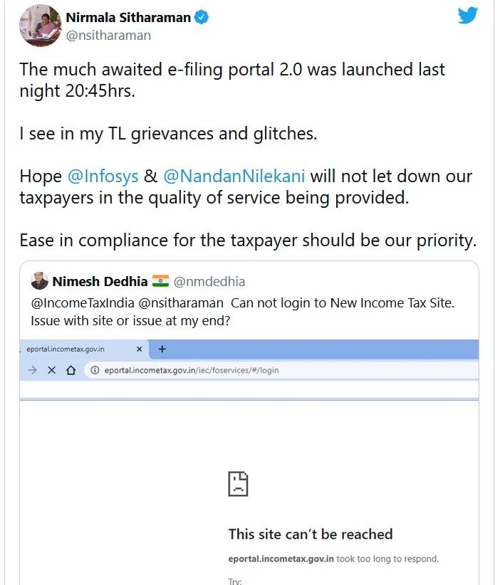 上面的推文用中文表达是,“让人期待已久的电子报税门户 2.0 已经于昨晚 20:45 正式上线。但种种不满与故障问题旋即出现。希望 @Infosys 与 @NandanNilekani 不要让我们的纳税人失望,请尽快提升服务质量。保障纳税人的合规性应该是我们最重要的使命。”