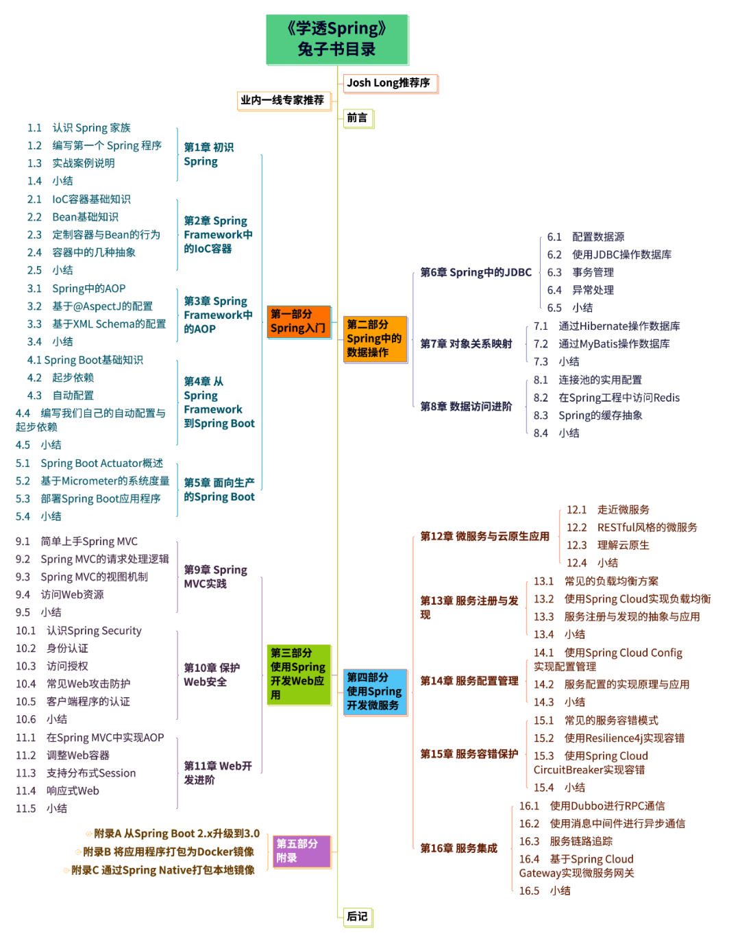 本书的内容涉及面非常广,囊括了 Spring 家族中的众多产品。全书一共分为五部分,其中正文四部分共计 16 章内容,最后一个部分是附录。