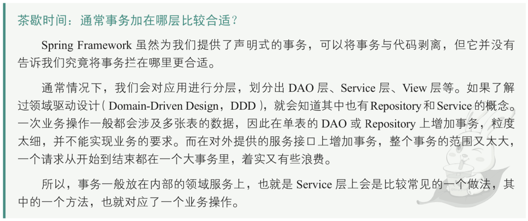 如果只是介绍 Spring 家族成员的各种使用方法,那未免有些无趣,遇到一些知识点时,我们还要由点及面,多介绍些相关的信息,包括但不限于背景知识、实用技巧、常见问题、实现原理等。例如,在介绍事务时,我们会聊声明式事务背后的原理;在处理金额时,我们会聊为什么不用浮点数类型,而要使用 Money 类型;在使用 JPA 时,我们会讲解 JpaRepository 背后的实现原理;在介绍服务注册机制时,我们会了解 Zookeeper 不适合做服务注册中心的原因……这些知识点很有意思,一方面可以加深我们对相关技术点的理解,另一方面也相当于我们从正文的学习暂停片刻,进行简单的梳理和思考。所有的这些内容,我们都以“茶歇时间”的形式呈现了出来。按本书编辑的说法,这才是我全书写得最有意思的地方,大家一定不要错过书中四十余处的“茶歇时间”。