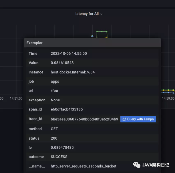 Exemplars 。这些是“特定轨迹,代表在给定时间间隔内进行的测量”。如果单击形状,可以跳到 trace ID 视图查看对应该的 trace.Tempo 查询 要么跳转到自己选择的 trace ID。您将看到以下屏幕。每个条形代表一个span 。我们可以看到完成每个操作所需的时间。如果单击给定的范围,我们可以看到与该特定操作相关的 tags(键值元数据)和计时信息。
