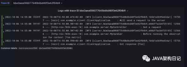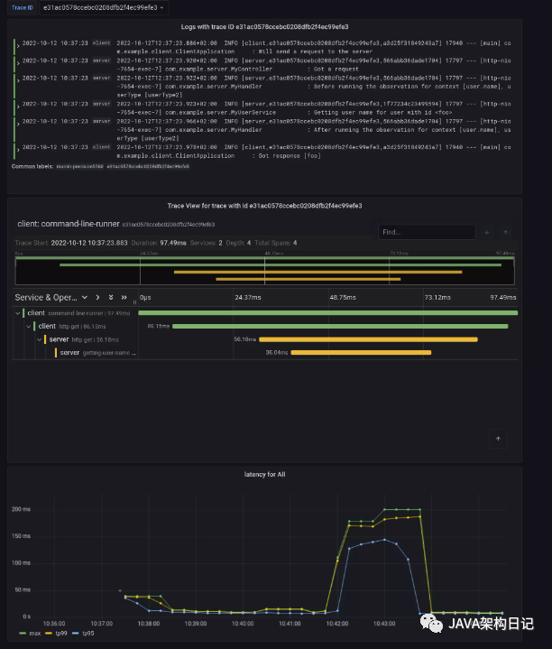 2022-10-04T15:04:55.385+02:00 INFO [client,bbe3aea006077640b66d40f3e62f04b9,93b7a150b7e293ef] 92556 --- [ main] com.example.client.ClientApplication : Got response [foo]打开 Grafana 仪表盘,然后单击 Logs, Traces, Metrics 仪表盘。在这里,您可以选择一个 trace ID(例如 bbe3aea006077640b66d40f3e62f04b9),以从两个应用程序中查找与该 trace ID 对应的所有 logs 和 traces 信息。应该会看到以下与同一 trace ID 相关的日志和traces 相关视图,你将看到在同一时间范围内发生的 metrics。这些指标与 HTTP 请求处理延迟有关。这些来自使用 Micrometer API 的自动收集的 Spring Boot WebMvc 信息。