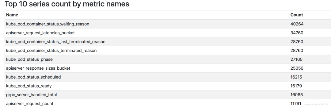 比如简单的服务如缓存等,类似 pushgateway,大约 120 个指标,prometheus 本身暴露了 700 左右的指标,如果你的应用很大,也尽量不要超过 10000 个指标,需要合理控制你的 label。