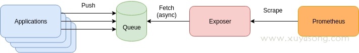 应用程序将 metric 推到到消息队列如 kafaka,然后经过 exposer 消费中转,再被 prometheus 拉取。产生这种方案的原因一般是有历史包袱、复用现有组件、想通过 mq 来提高扩展性。