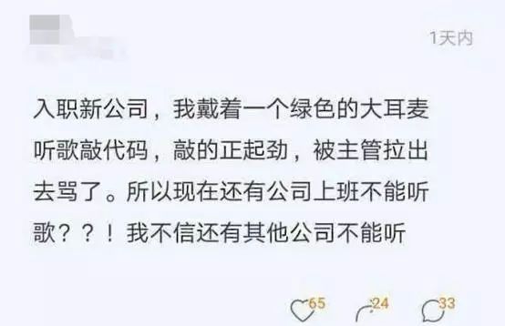 2、第二种情况就是公司太吵。开发工作,有很多逻辑内容,需要静心思考,有时候一个逻辑要想很久,不能被打断,打断会很痛苦,参考写作文的时候的感受。然而,同个办公室总有些需要大量说话的职位,会干扰到程序员。甚至公司会有些闲人,唧唧哇哇,说些八卦什么的,有时候挺吸引人,但是眼看deadline越来越近,必须静心敲代码,耳机放个音乐能过滤掉周围的声音。如果公司能用隔音耳塞,当然是更好的选择,但是耳塞实在突兀,耳机就和谐很多。